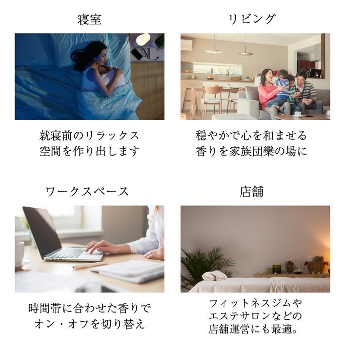 時間帯ごとに香りを自動切替できるので、朝は爽快な香りでアクティブに、夜は落ち着いた香りでリラックス空間を演出可能。