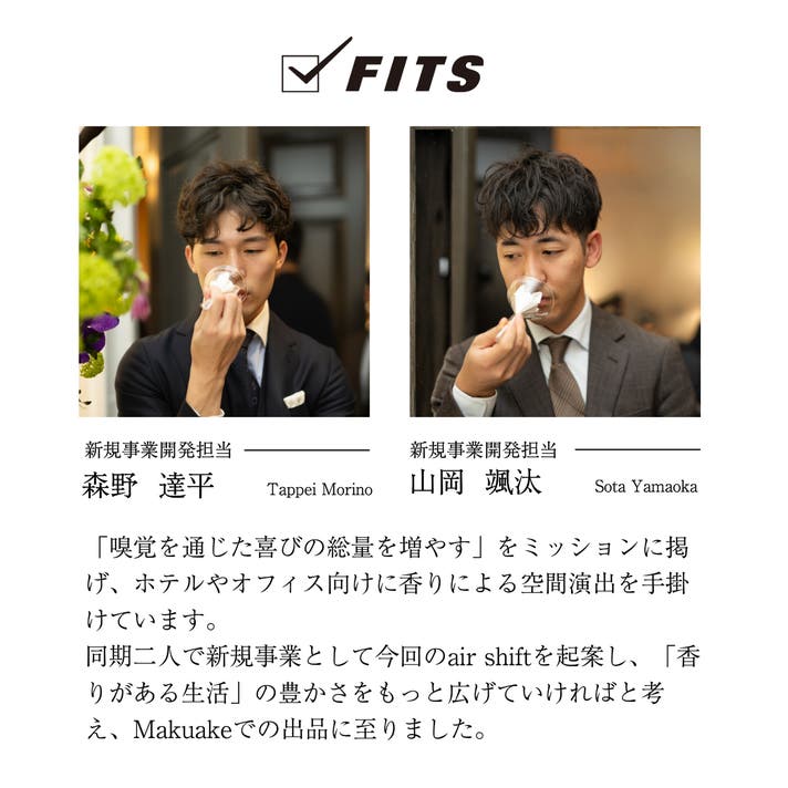 「air shift」は、私たちフィッツコーポレーションが培ってきた「香り」の知見と、時代の変化が生んだ新しい「時間」の概念が融合して生まれた、全く新しい製品です。このプロジェクトを通じて、香りの力で生活のリズムを整え、皆さんの毎日をより豊かにするお手伝いができれば幸いです。