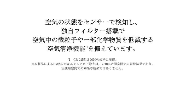 ※本製品によるPM2.5/ホルムアルデヒド除去は、の10m密閉空間での試験結果であり、実使用空間での効果や結果ではありません。