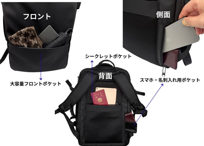 最も手が届きやすい側部にスマホ用のポケットを、手の届くフロント下部には