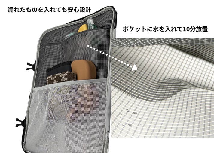 折り畳み傘や500mlペットボトルも入る収納力抜群のポケットを搭載。