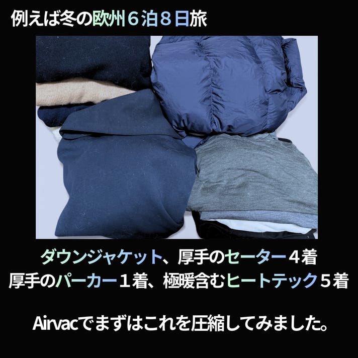 半信半疑で使いましたが、これまでの圧縮袋(メーカー従来品)とは段違いで驚くほど入りました。出発時は寒く、羽田までダウンを着て行っていたので、かなり助かりました。