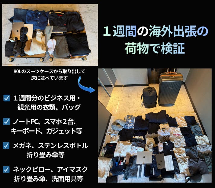 1週間用のスーツケース約4-5kgと比較して、3分の1の軽さで同程度の量を運べます。