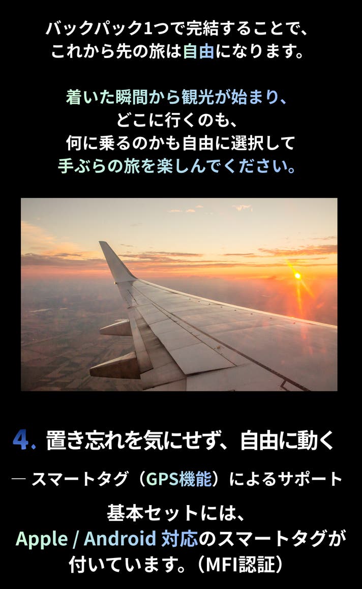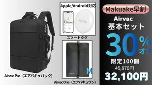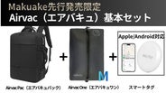 Airvac Pack本体の機能だけでも、高機能軽量バックパック+自動圧縮袋を兼ね備えていますが、こちらの限定基本セットには、日常でも使える単体の自動圧縮袋とApple/Android両方に対応するMFI認証済みのスマートタグが付いた大変お得なセット価格です。