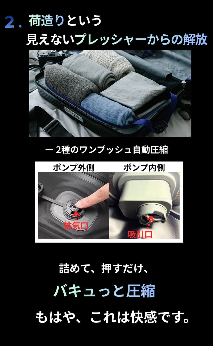 - 【荷造りからの解放】2種のワンプッシュ自動圧縮袋で、別次元の圧縮体験。詰めて押す→放置で完了