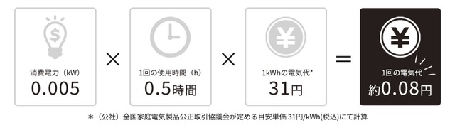 本製品は、消費電力5Wで1回最大約30分ご使用いただけます。その電気代は、わずか約0.08円!電気代は、電子レンジで解凍*するよりもお得にご使用いただけます。