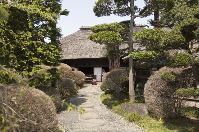 小川が流れる交差点の傍にたたずむ、かやぶき屋根の建物があります。そこでは、江戸時代から伝わる染めの手法に、日々の試行錯誤による研究の成果が重ねられ、『益子染め』とも呼べるような、世界に通用する藍染めの布が生みだされています。