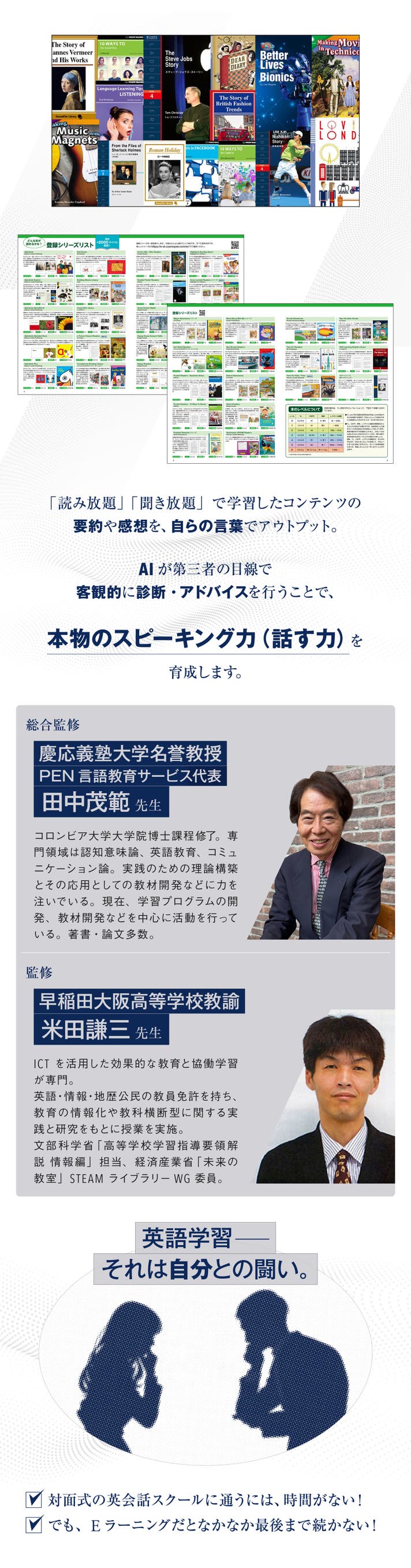 現在、コスモピアeステーションには「英語読み放題コース」で約3,000、「英語聞き放題コース」で約3,000の教材コンテンツがラインナップされています。多聴多読でしっかり土台をつくれたら、その中から、2026年4月からは約200コンテンツでAIスピーキングのトレーニングをスタートできます。(AIスピーキング対応コンテンツの数は毎月拡大していきます。)