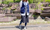 Tシャツに合わせて着るキャンプベストコーデ。シンプルコーデに、キャンプベストを羽織るだけで全体的に引き締め効果が得られ、いつもと変わったイメージになります。