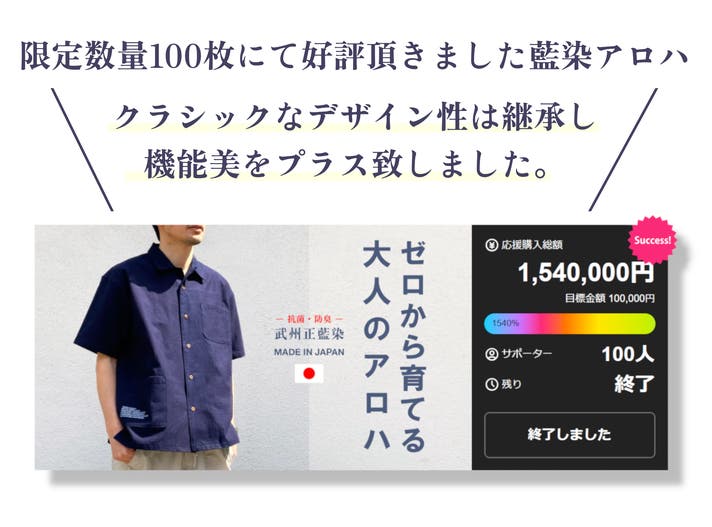 ・ 藍染の製品は特性上、強い摩擦(特に湿った状態での強い摩擦)や、汗や雨などで濡れた時はほかの衣料品などに色移りの可能性がございます。あらかじめご了承お願いいたします。 ※皆様の応援購入により量産効率が向上した場合、正規販売価格が予定価格より下がる可能性もございます。 ※デザイン・仕様は変更になる可能性もございます。ご了承ください。 ※ご注文状況、使用部材の供給状況、製造工程上の都合等により出荷時期が遅れる場合があります。 ※使用感等に関する返品・返金はお受けいたしかねます。 ※応援購入の数が想定を上回った場合、製造工程上の都合等により出荷時期が遅れる場合がございます。 本文中に記載させていただいたスケジュールは、あくまでプロジェク ト公開時点の予定です。 応援購入の性質上、配送遅延のおそれがございます。 原則として、配送遅延に伴う応援購入のキャンセルはできませんが、 リターン配送予定月から1ヶ月を超えた場合には、希望者に限りキャンセルにて対応させていただきます。配送に遅れが生じる可能性が判明した場合、直ちにご報告させていただきます。 ※本プロジェクトの実施において十分確認は行なっておりますが、類似品が発覚する可能性がある点、ご了承願います。 ※本プロジェクトを通して想定を上回る皆様から応援購入を頂き、現在進めている環境から量産体制を更に整えることができた場合、正規販売価格が販売予定価格より下がる可能性もございます。 【商品等の不具合による返品・交換】 原則として、サポーター都合によるキャンセル・返金は承っておりません。 (サポーター都合のキャンセル不可の例:サイズが合わない、誤注文、長期不在) ◾️対応条件: 商品の初期不良、またはお届けした商品がご注文内容と異なる場合、到着後7日以内にプロジェクトページの「実行者にメッセージ」よりご連絡ください。状況を確認の上、交換対応をさせていただきます。 ◾️返品送料/再送料:実行者負担 *長期不在や転居、登録住所間違いにより商品が返送された場合、再発送の送料はサポーター様負担となります。 【返品・交換をお受けできない商品】 ・サポーターの責任により破損、汚損が生じた商品 ・お届けから日数が経過している商品(原則7日以上) ・使用済みの商品 ・タグが外されている商品 ・お客様のもとで破損・汚損が生じた商品 ・事前にご連絡を頂いていない商品 ・商品到着後、7日以上経過した商品