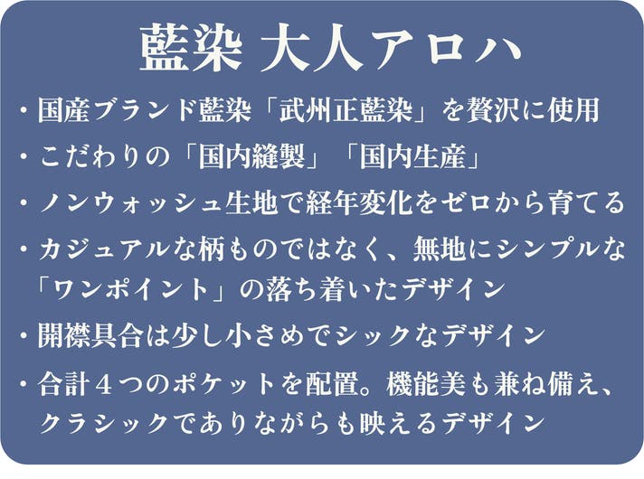 江戸時代より繋いだ日本の誇り。希少価値の高い「武州正藍染」を贅沢に使用した"大人のアロハシャツ"