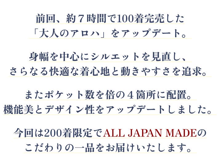 もっと日常的に、身近に、そしてカジュアルに日本が誇る伝統文化を日常に取り入れてもらいたいという思いから、今回の「アロハシャツ 」第二弾をリリースしました。