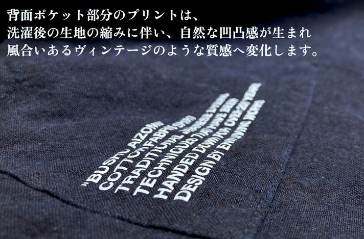 また、後ろポケットには"武州正藍染の説明"がプリントされており、こちらもデザインのアクセントになってます。