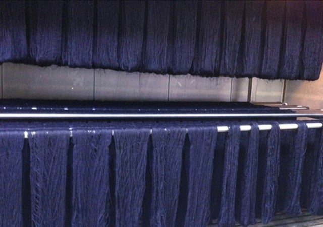 糸が芯から染め上がり織りあがった時に温かみのある自然な縞(青縞アオジマ)を生み出します。