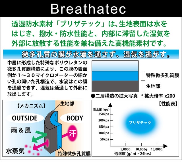 - 生地表面は水をはじき、撥水と防水性能をもち、内部に滞留した蒸気を外部に放散する性能の高機能素材