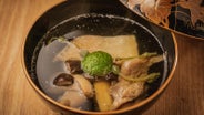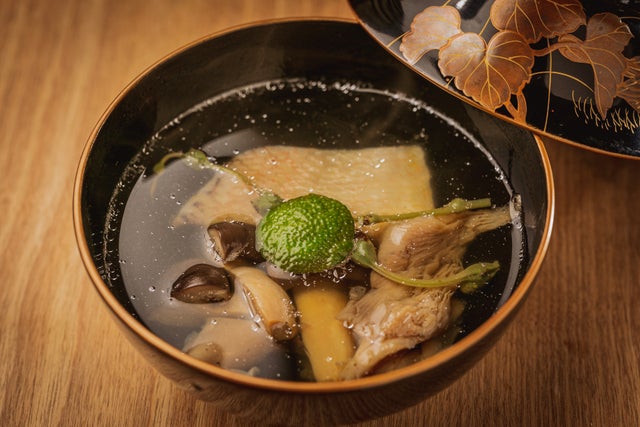 なかに入れる具材にも季節感を演出。夏なら天然鮎と、叩いたおくらをのせた卵豆腐をおわんに入れ、ほんのり青柚の香りをきかせたものを。