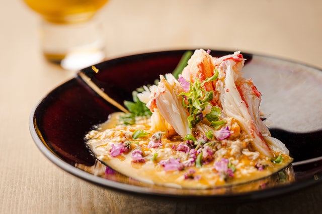 例えば、毛蟹やずわいがになど旬のカニを使った蒸しカニには、特製のウニソースをかけて。