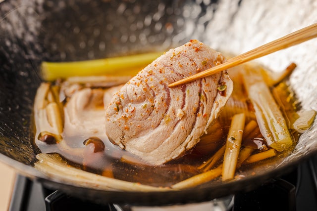 火が加わり、とろけるような食感の頭肉をかつおぶしベースの濃厚なスープとともにお召し上がりください。