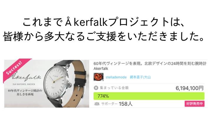 今回のプロジェクトはÅkerfalk Aventyr(オーカーフォーク・アヴェンター)24時間表示腕時計の限定販売になりますが、このプロジェクトをきっかけにして、これからも様々な "魅力的な商品" を皆様にお届けします。
