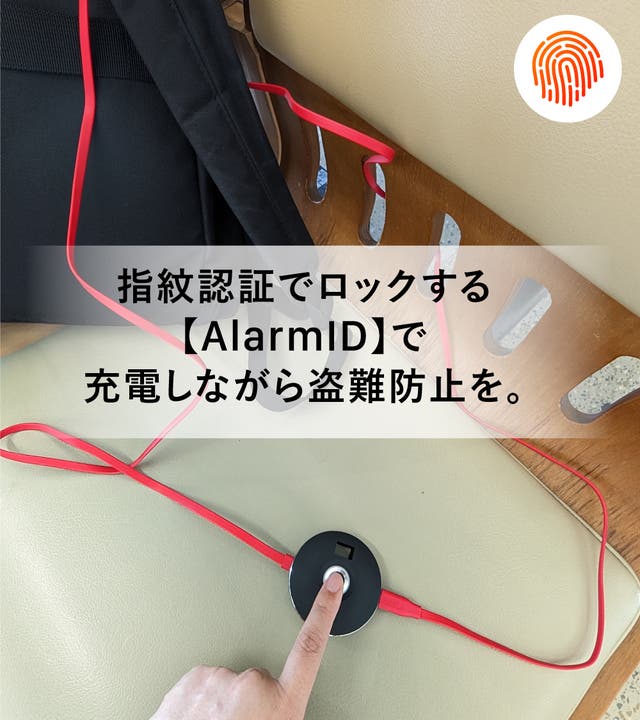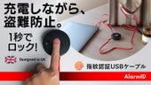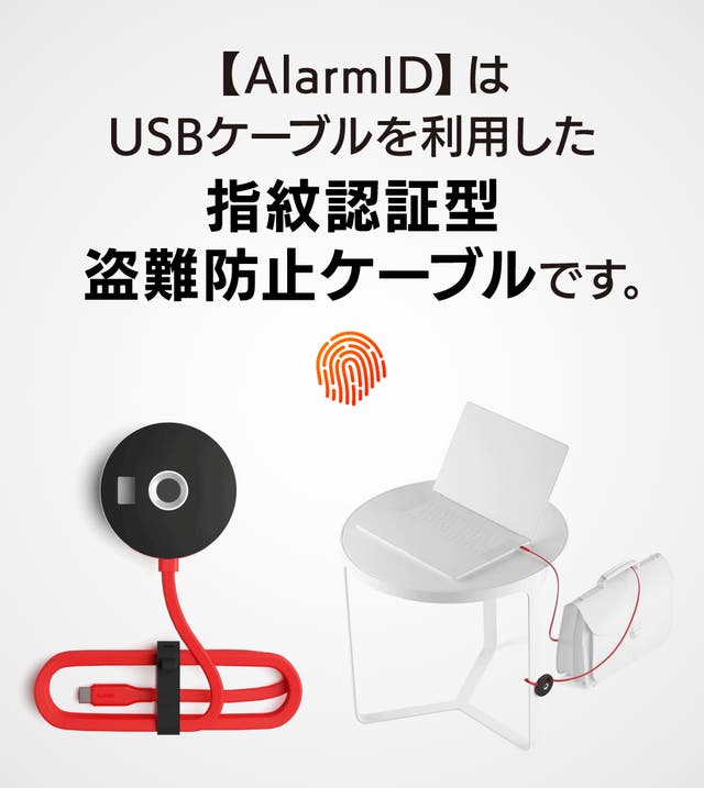 【AlarmID】はノートPCやタブレットを充電できる2mのUSBケーブルに、指紋認証型のロック機能を搭載した、盗難防止ケーブルです。