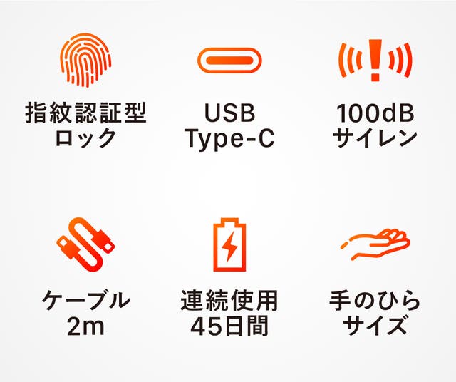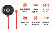 - 指紋認証で解錠を行うUSBケーブル型のワイヤーロック。デバイスやバッグを連結して盗難防止
