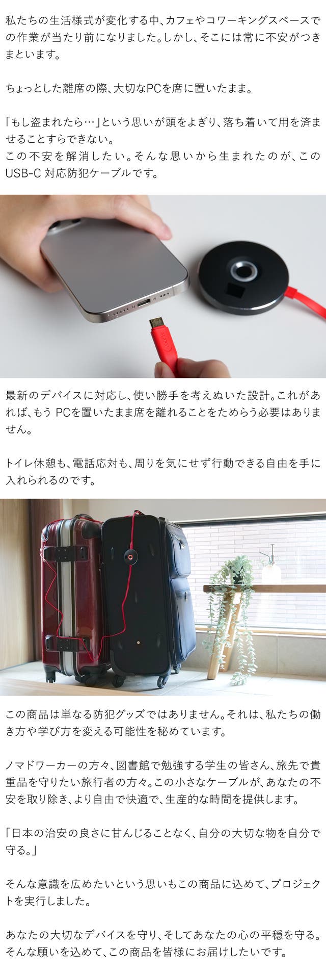 本体から伸びるケーブルで電源が確保できない場所でも、本体のケーブルを本体のUSB-TypeCポートに差し込めば通常のワイヤーロックと同じように使えます。