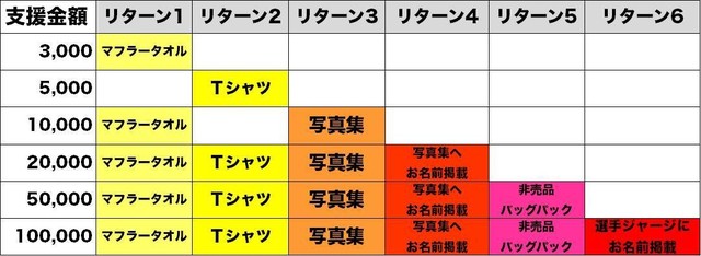 応援グッズとしての必需品である「タオルマフラー」「Tシャツ」から、球団として初めてトライした「豪華写真集」など、グッズを購入いただく感覚でその一部を支援に充てていただけます。