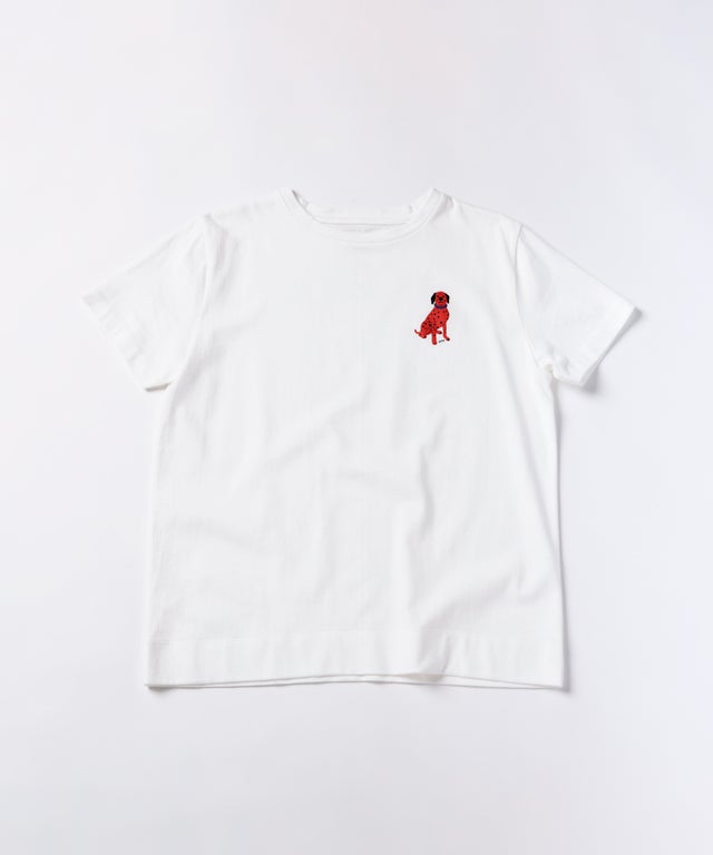 吉泉ゆう子さん書き下ろしダルメシアンのイラストにアルドリッジ創業年の数字を組み合わせたオリジナル図案。左胸にワンポイントでラバープリントしました。