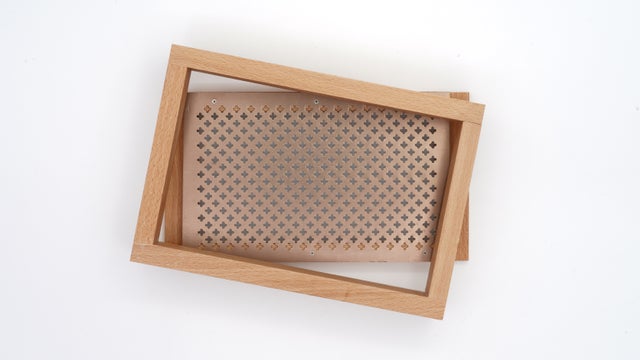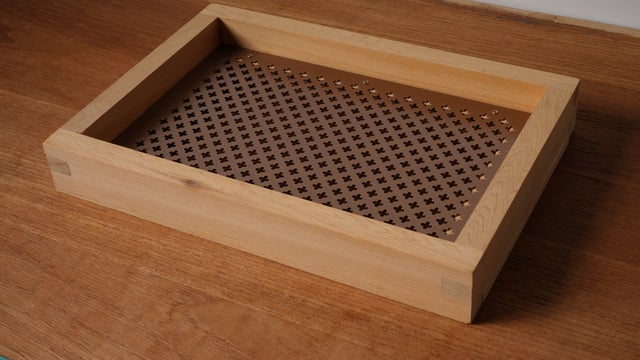 【紙すき機】上は目の細かいメッシュ状の繊維(網)、下は花模様の金属板、二段重ねの水切り構造となっています。漉き網がついた一層の枠とは違って、二段構造だからくっつきにくく、効率よく紙を漉きことができます。伝統的な「簀桁(すけた)」という道具から着想したもの。簀(す)は竹でできたすだれ状のもので、桁(けた)は上下の木の枠のことです。上下に揺らして水を切り、簀の上でパルプがきれいに平たく広がります。