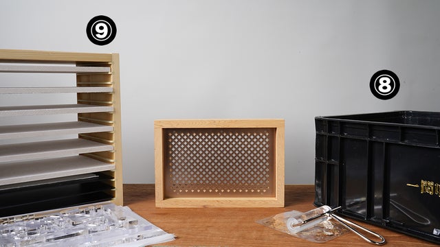 ⑨乾燥ラック|伝統的な干し板のミニチュア版。簡単に組み立てられ、縦にすれば収納に便利。(10のスペースに区切られ、乾燥板/吸水板/型枠を収納できます。)