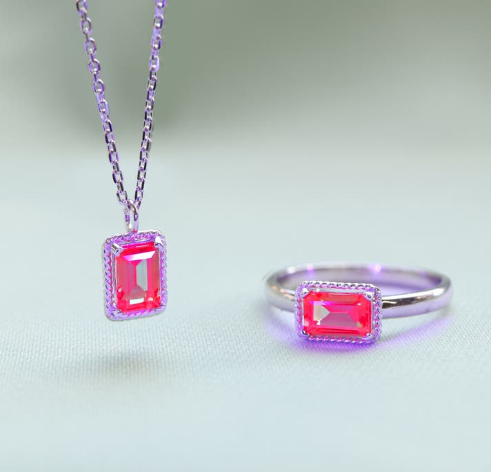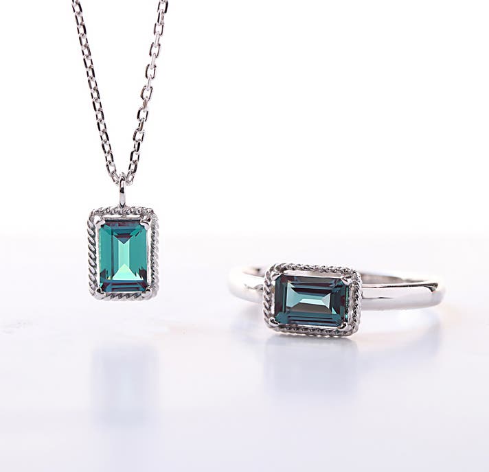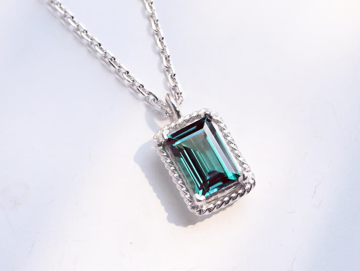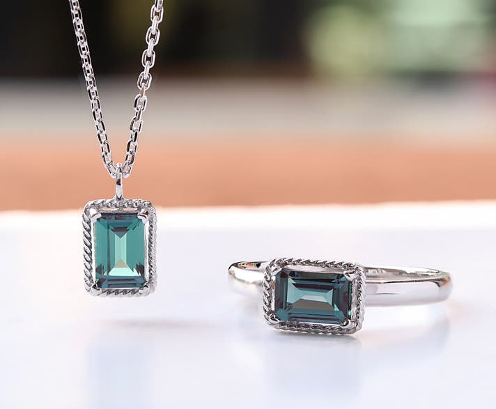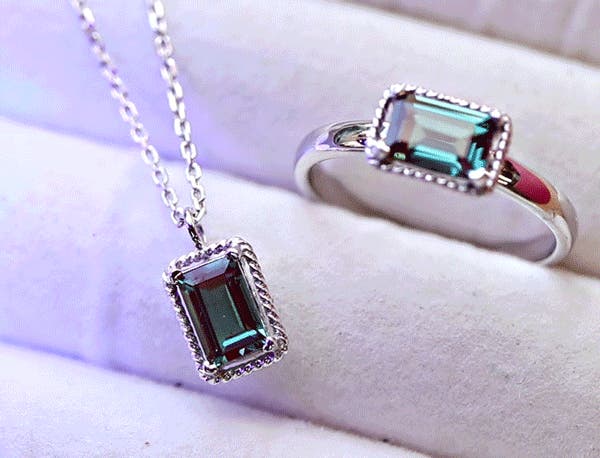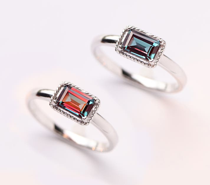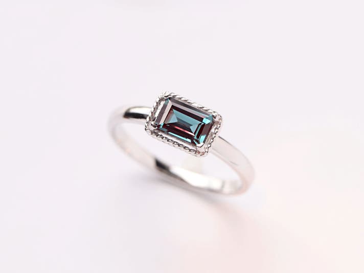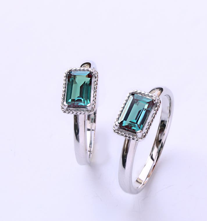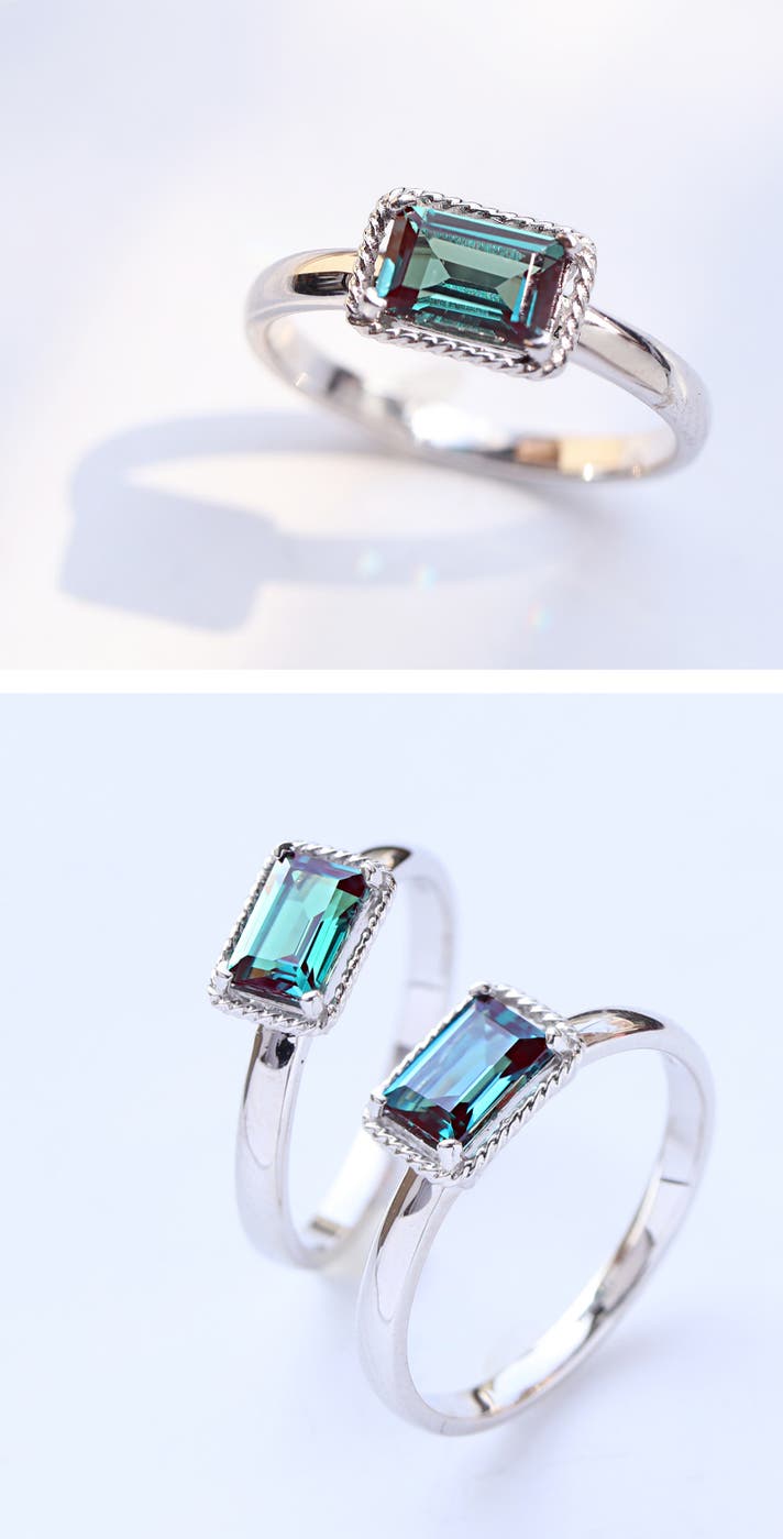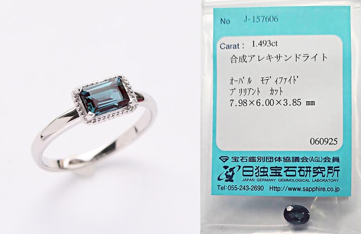 天然のアレキサンドライトと全く同じ組成と結晶構造を持ち、美しい『変色効果』を宿しています。