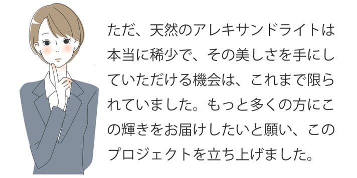 「世界三大希少石の一つと称されるアレキサンドライト。その神秘的な輝きを、もっと多くの方にお届けしたいという情熱から、このプロジェクトは誕生しました。」