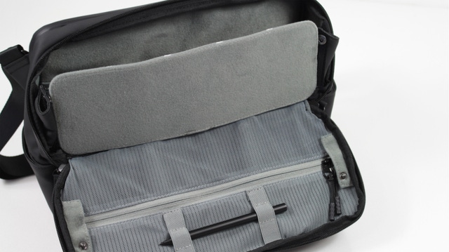 三角形の前面部を反転させることで、テックポーチに変身。 テックポーチには、小物用のガジェットパネルを搭載。バッグ内側を隠し、プライバシーを確保することも。