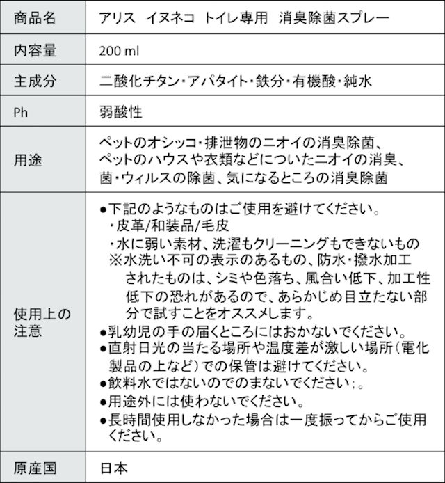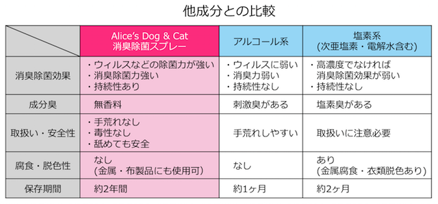 アリス イヌネコ トイレ専用 消臭除菌スプレーと他成分との比較は下表の通りです。