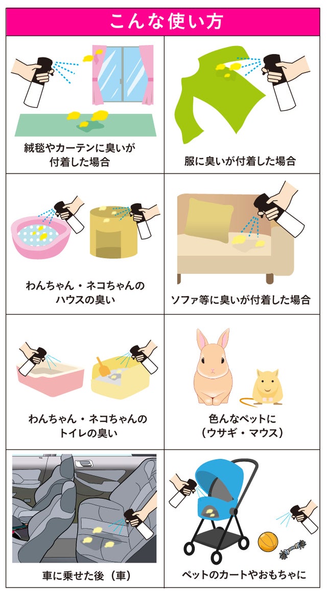 A: オシッコの臭いに効くように成分調整していますが、生ゴミやおう吐物、その他臭いにも効果がある場合もありますのでお客様でお試しください。