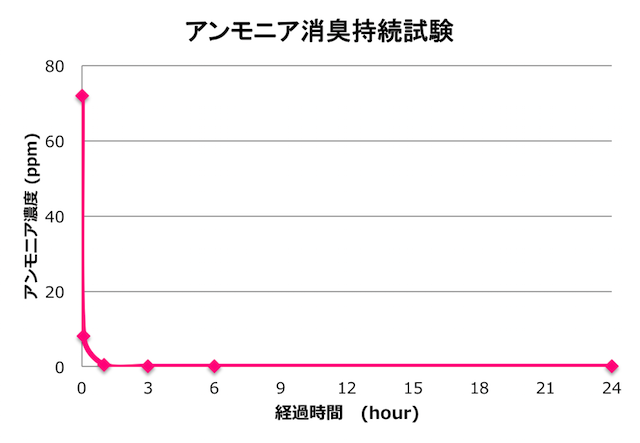 ペットのオシッコのニオイの主原因であるアンモニア臭の消臭テストをしました。ニオイが5分内でほぼ消えて、1時間後にはニオイ戻りもなく消えました。