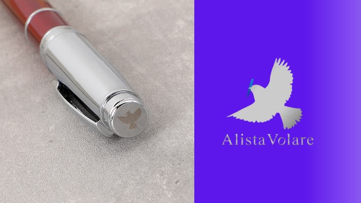 ボールペンの天冠に配置されたブランドロゴは、当ブランド「アリスタヴォラーレ」の象徴です。イタリアの国鳥であるイタリアスズメがペンを加えて飛び立つ姿には、未来へ向かって羽ばたく挑戦者の姿が重ねられています。