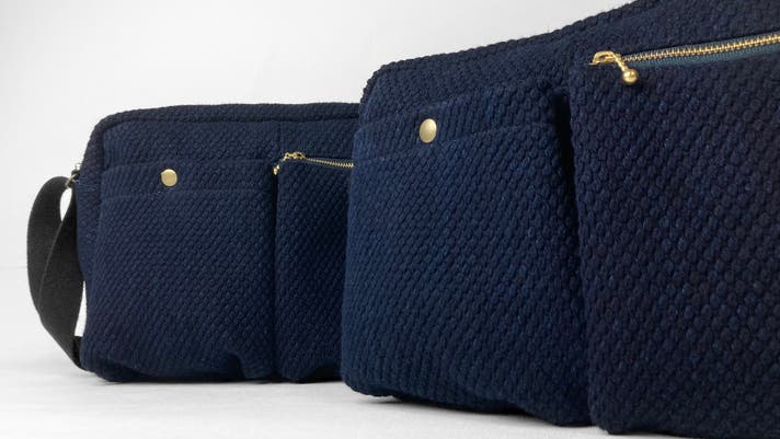 今回のバッグに使用する生地は、ブランド藍染である武州正藍染刺子(ぶしゅうしょうあいぞめさしこ)の二重(ふたえ)生地を使用しております。