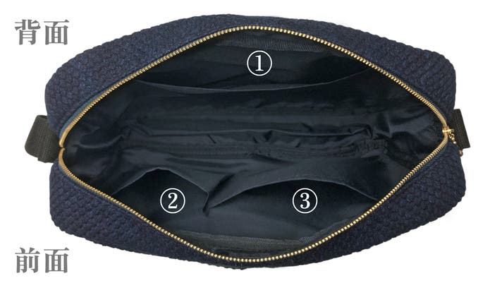 背面に大きめのポケット①と前面に仕切りがついたポケット②/③を配置しバッグの中の荷物の仕分けにとても便利です。