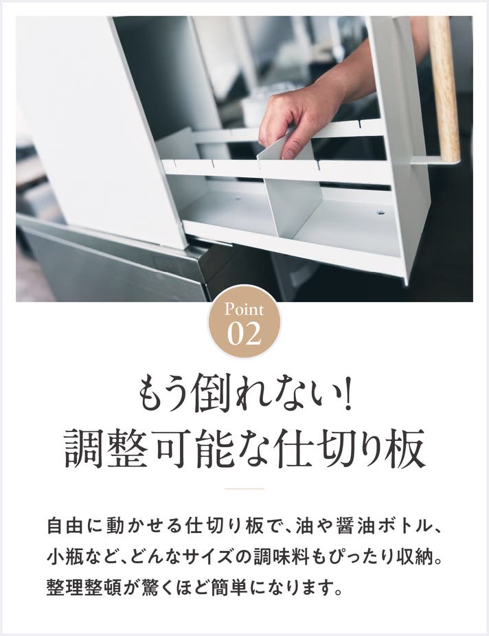 さらに、調味料が少なくても中で倒れないよう、仕切り板を調整可能にしました。