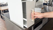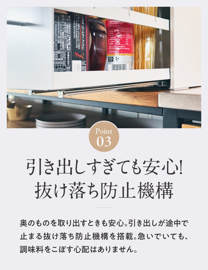 最後までいっぱいに引き出しても引き出し部分が手前に抜け落ちてしまわないよう、レールは抜け落ち防止機構を採用。調味料や瓶類など重さのあるものを収納していても、レールのストッパーがしっかりと支えるため、不意に引き出しが外れて中身が落下する心配がありません。奥までしまった調味料もスムーズに取り出せ、快適にお料理ができます。
