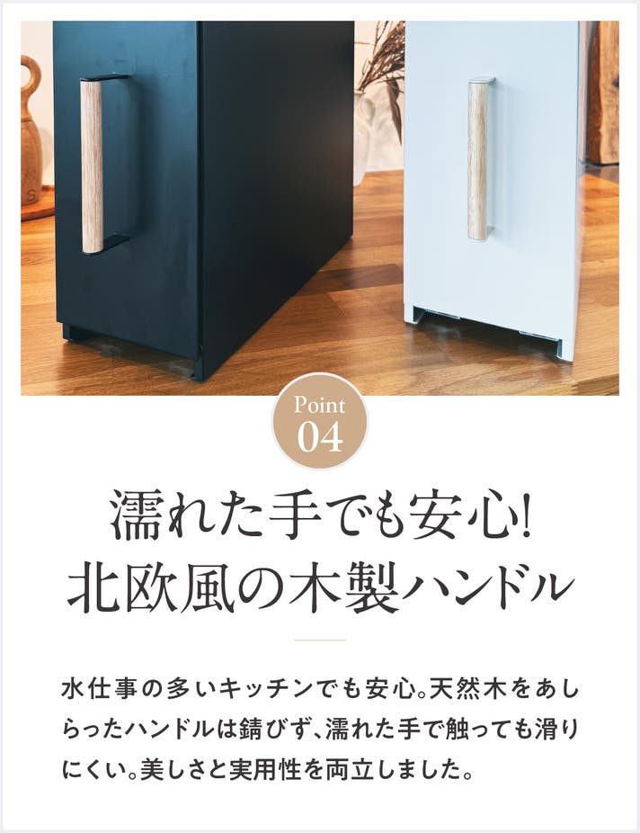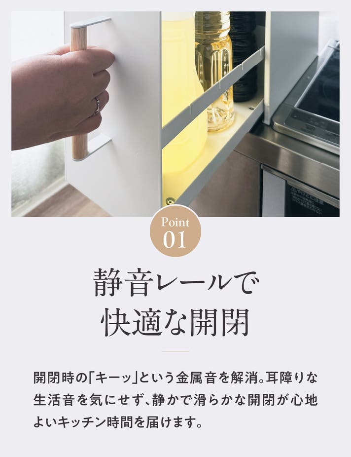 家具や高品質な収納家具にも採用されている静音スライドレールを採用。レールは本体の底面に設置されているため、重量のある調味料やボトル類を収納してもスムーズに開閉でき、耐荷重もアップ。滑らかに引き出せ、開け閉めの際に発生するガタつきや金属音を抑え、静かで快適な使用感を実現。忙しい料理の最中でもスムーズに使用いただけます。