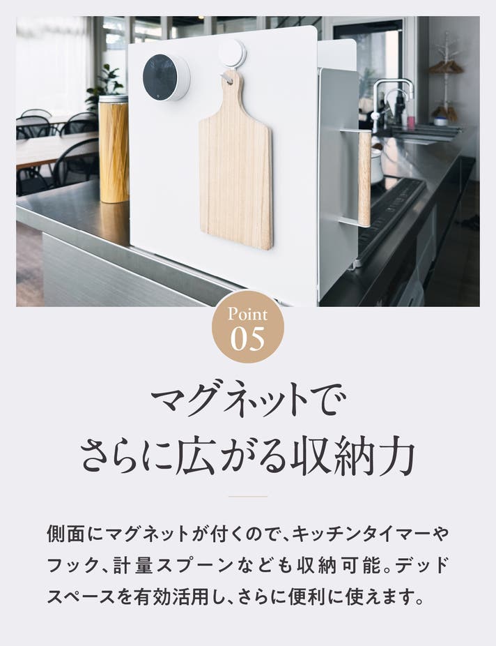 スチールでキッチンタイマーや小型ラック、スプーンホルダーなど、マグネットが付くアイテムを自由に取り付けることができます。側面や前面など空いたスペースを有効活用できるため、調味料だけでなく、よく使うキッチンツールや小物を手の届く位置にまとめて収納することが可能です。これにより、作業スペースを広く保ちながらも収納力を大幅にアップでき、調理の効率も向上。自分の使いやすいレイアウトにアレンジできるので、キッチン全体がよりすっきりと快適な空間になります。