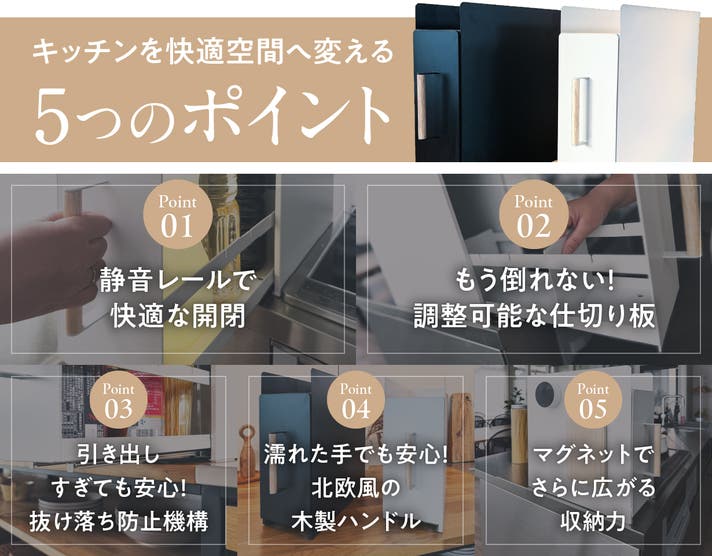 A.本製品は静音スライドレールと扉部分のシリコンシールを採用しており、開閉音を抑えた設計です。特に早朝や夜間の使用でも音が気になりにくく、静かなキッチンに最適です。
