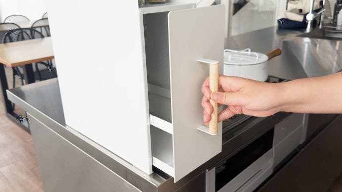 幅はわずか14.5cmのスリム設計。これまで使い道が限られていたコンロ脇の細いすき間を有効活用できます。調味料ラックを手元に置けるため、調理中にわざわざ後ろの棚や別の場所まで取りに行く必要がなく、片手でサッと取り出せてスムーズに調理が可能です。デッドスペースを収納に変えることでキッチン全体の作業動線が短くなり、効率的で快適な料理時間を実現します。