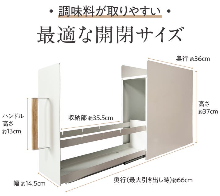外形サイズ:(約)幅14.5cm × 高さ37cm × 奥行36cm(引き出し時66cm)
