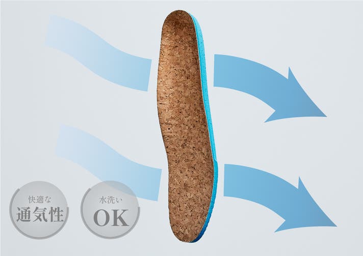 コルクと発泡ウレタンを組み合わせ、通気性と柔らかなクッション性を実現。