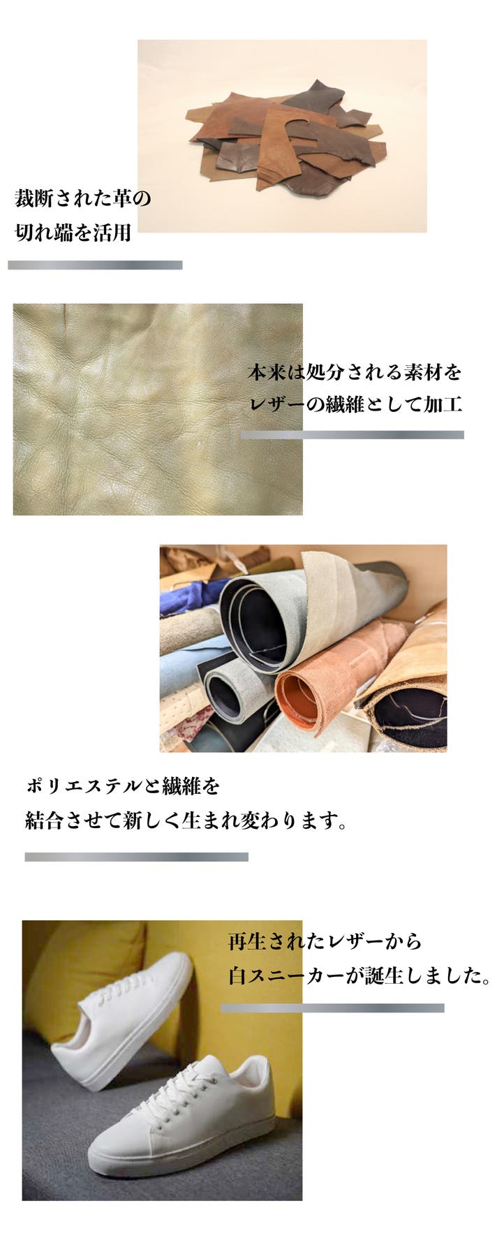 リサイクルヴィーガンレザーは、循環型のアップサイクルレザーです。回収は、衣類、靴、ハンドバッグ、家具の製造プロセスから収集され、一連の洗浄プロセスの後、リサイクル可能な革生地を更に選別し使用します。