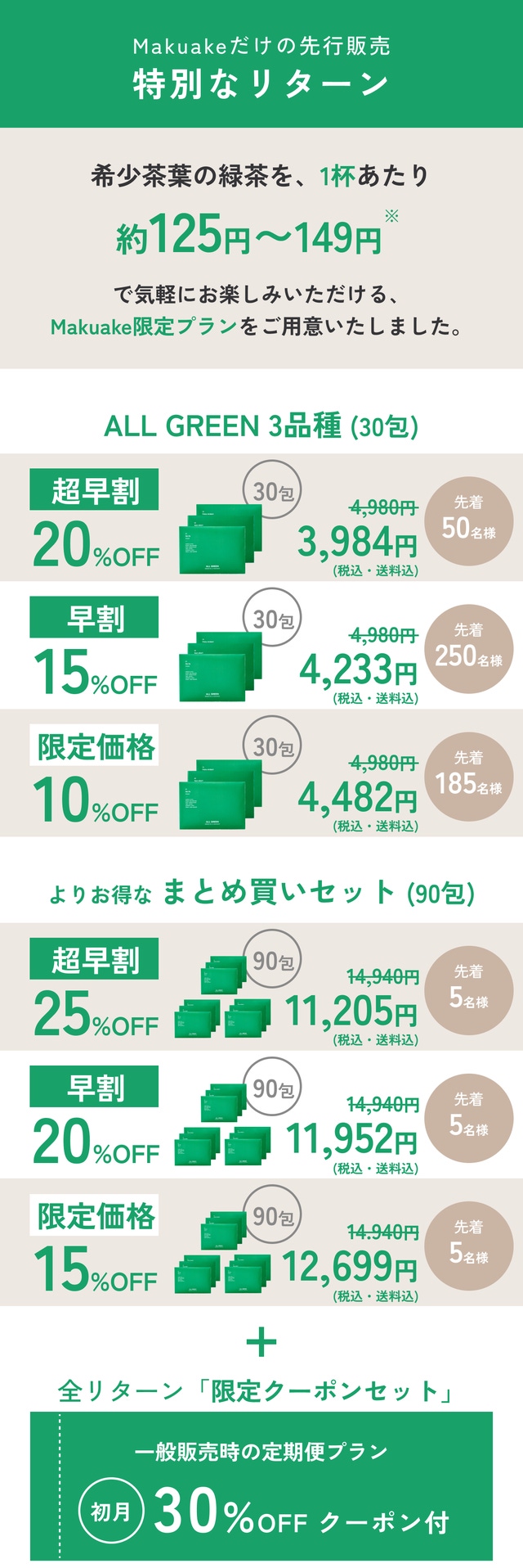 A. 今回のMakuakeはお得に「単品購入」や「まとめ買い」していただける先行販売となります。Makuake終了後は2023年初夏にALL GREENオフィシャルサイトで一般販売(サブスク形式)を予定しています。習慣化にぴったりの定期便プランを準備中となりますので、今後の最新情報は公式サイトよりご確認ください。