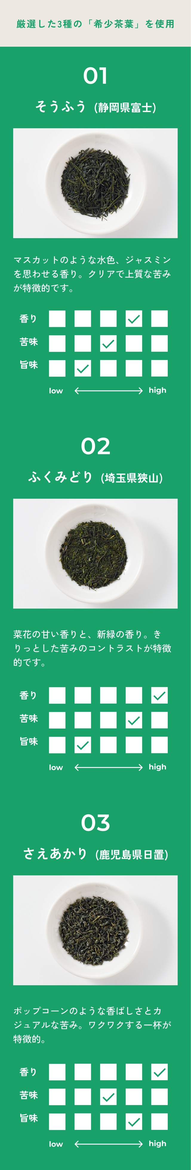 私たちはシングルオリジンと一番茶にこだわった製品作りに取り組み、緑茶の楽しみ方と価値を底上げしたいと考えています。